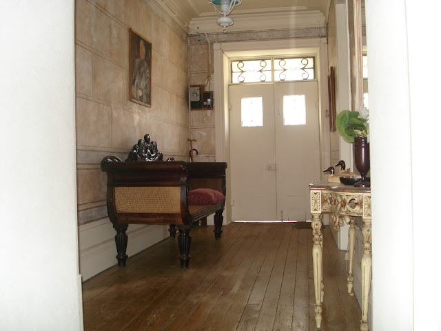 Um chapeleiro de ferro forjado pintado de branco, com o seu balde de zinco velho que alberga uma hera. Uma mesinha também em ferro forjado com um velho candeeiro tulipa e um anjo de mármore, já sem um bracinho com o seu cálice médicis, também de mármore, cheio de píonias artificiais e a moldura cinza imponente restaurada na oficina. É assim que vou variando a decoração cá de casa, pois nada tem o seu lugar definitivo, muito pelo contrário, uma peça acabada de chegar pode fazer com que tudo, ou quase, mude de lugar.